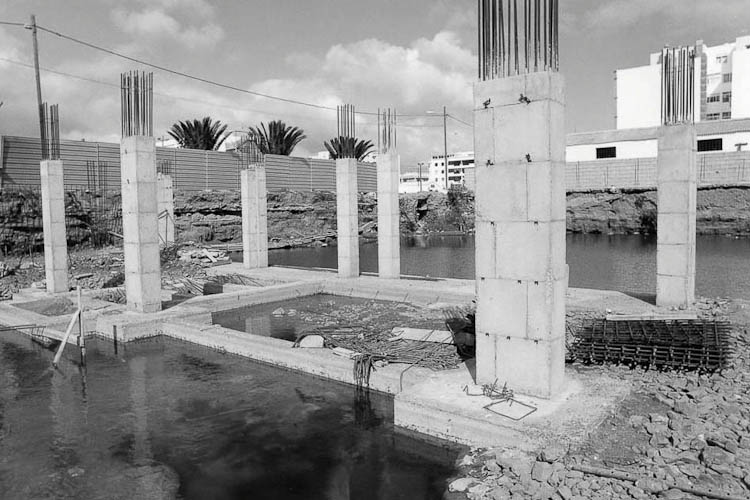 There was, however, a new stupefying aspect to the similarity. The chronological order. Our respective developments followed a similar pattern. Up to a point, as Baltz had moved on to conceptual art and made a clean break with New Topography, whereas I have found myself more than happy digging in and around the visual aspect I shared with Baltz.The impetus to move on came, as it is customary, unexpectedly both in time and place. It happened in a dentist's waiting room while browsing an architecture magazine. I was strongly attracted to a photograph of a building site which easily transcended the context of where the image was published. Time showed, however, that even I underestimated how far-reaching importance this image would have for me. At the time I only felt it was an exquisite guiding light and that I should perhaps try to recreate the atmosphere or whatever it was it contained. Turned out it was not the easiest of acts to follow and it took me some time before I understood the image and was ready to have a go of my own. Although, to make a digression, one might also wonder if I could not stake a claim to the authorship of this image simply on the grounds of having discovered a new and distant context that has nothing in common with the original purpose of this photograph. So, after some basic research, (having been forced to delay my journey to Egypt, where as it happens two of my projects crossed each other's path) I left for Lanzarote, the island with plenty of commercial buildings under construction and where access is open and simple, unlike in Britain. The first few days however did not seem to vindicate my choice of destination. The feeling was sinking in rapidly that my expedition was a rather comprehensive miscalculation, and just another proof that certain things in life simply cannot be planned. Then, just as I was doing my utmost to find an early way out of the island, while walking back to my hotel from a bus stop, in exasperation at my situation and tired from a lot of walking I decided to recover by resting my hands and head on a brick wall as if to see what is on the other side. I say 'as if' because I did not really want to know what was on the other side, as my mind was not on the island anymore. I must have passed this wall at least ten times in the previous few days. As the wall was the height of my shoulders, the only way I could see what was on the other side was if I leaned closely against it, which accounted for my oversight of the little miracle confronting me now. On the other side of the wall, completely below street level was the most exquisite site I could have ever dreamt of.
